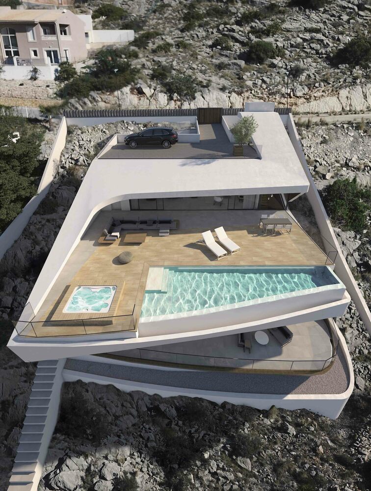 De moderne architectuur van deze Design Villa van 490 m2 voorzien van 4 slaapkamers en 4 badkamers en suite, is briljant te noemen. Bij aankomst op de ruime parking ga je vervolgens met de lift of met de trap naar beneden waar de living van 83 m2 met open keuken inclusief kookeiland is op verdieping -1. De hoogwaardige luxe, de natuurlijke materialen, de wandbetegeling aan 1 zijde, de grote ramen en de schitterende bio-ethanol haard geven deze ruimte een betoverende sfeer. Deze verdieping heeft ook een apart toilet en een bijkeuken. De buitenruimte aan de zwembadzijde, met panoramisch uitzicht over de zee, natuur en de bergen, heeft een groot terras van 120 m2 welke deels (48 m2) overdekt is. Naast het 35 m2 grootte infinity pool is er op deze verdieping ook een jacuzzi.