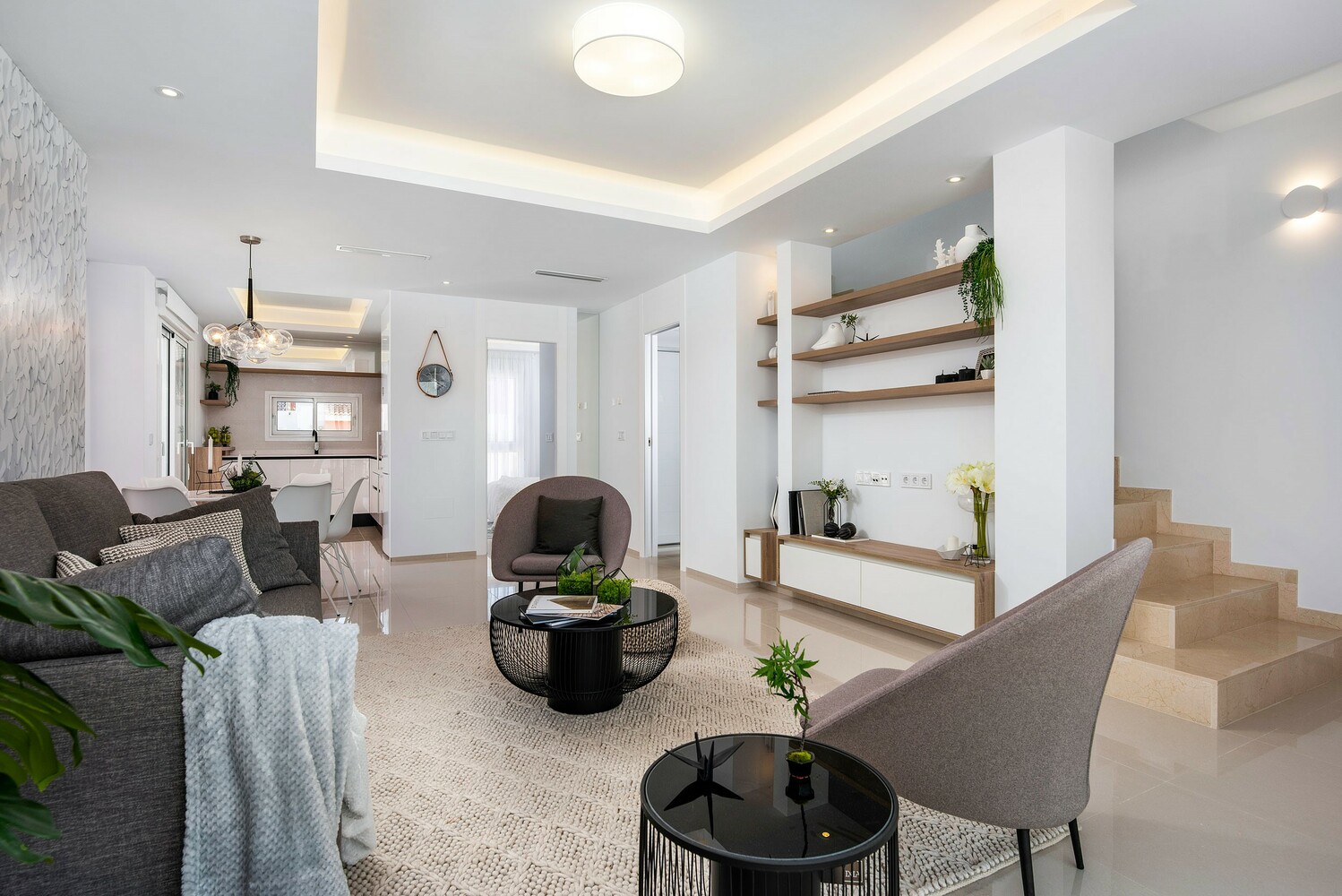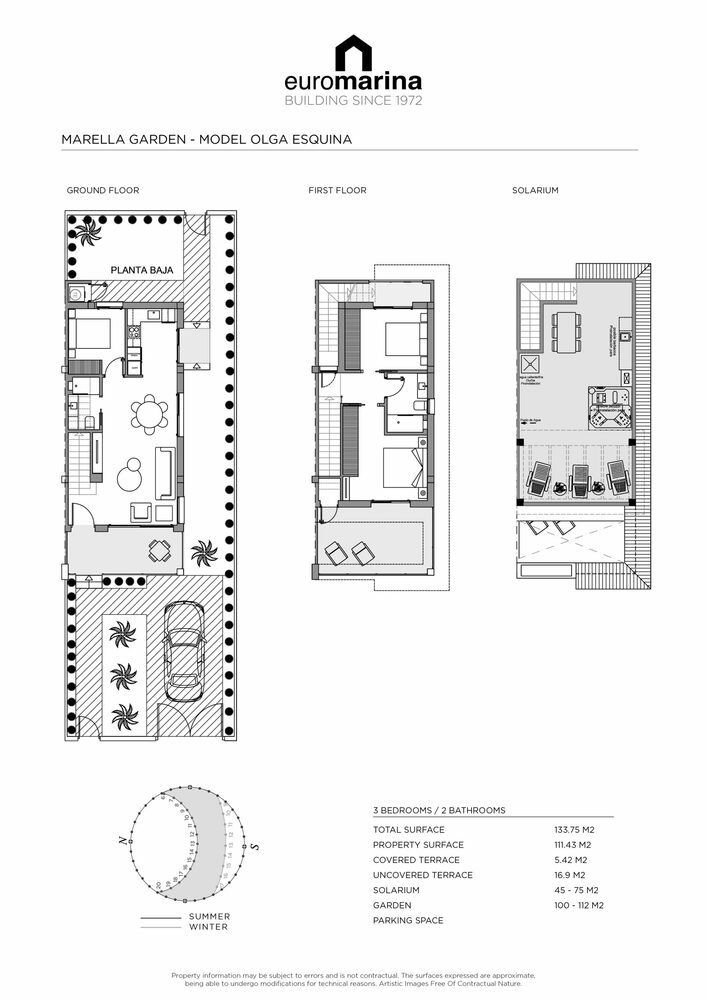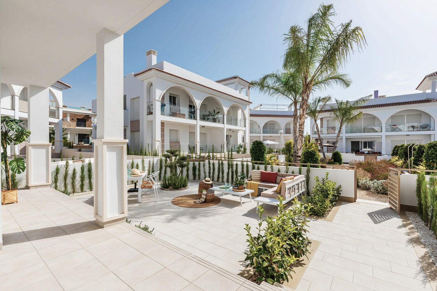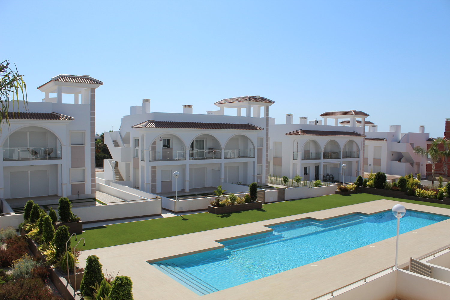 Deze zeer smaakvolle in moderne Mediterrane stijl vormgegeven twee-onder-een-kap / Hob Villa’s met 3 slaapkamers en 2 badkamers met vloerverwarming zijn gebouwd op een kleinschalige afgesloten urbanisatie. Het woonoppervlak is 117 m2. Op de begane grond is 1 slaapkamer en 1 badkamer, de 2 overige slaapkamers en de 2e badkamer bevinden zich op de 1e verdieping. De tuin aan de voor-, zij- en achterkant heeft een groot betegeld terras en aangrenzend aan 1 slaapkamer op de 1e verdieping is een terras van 17 m2. De Villa’s hebben allen een privé oprit en een solarium met een betonnen pergola. De grootte van het solarium varieert tussen de 45 m2 en 75 m2. De binnentuin met mooie beplanting heeft een groot gemeenschappelijk zwembad. Het kwaliteitsniveau van deze woningen ligt bijzonder hoog, er is gebouwd met hoogwaardige materialen en aandacht besteed aan de kleinste details waardoor de woningen een zeer luxe uitstraling hebben.