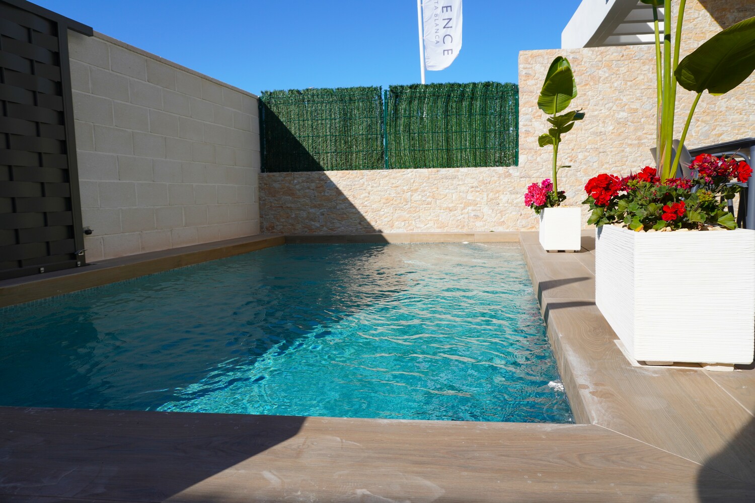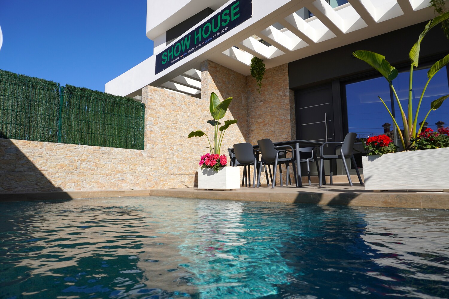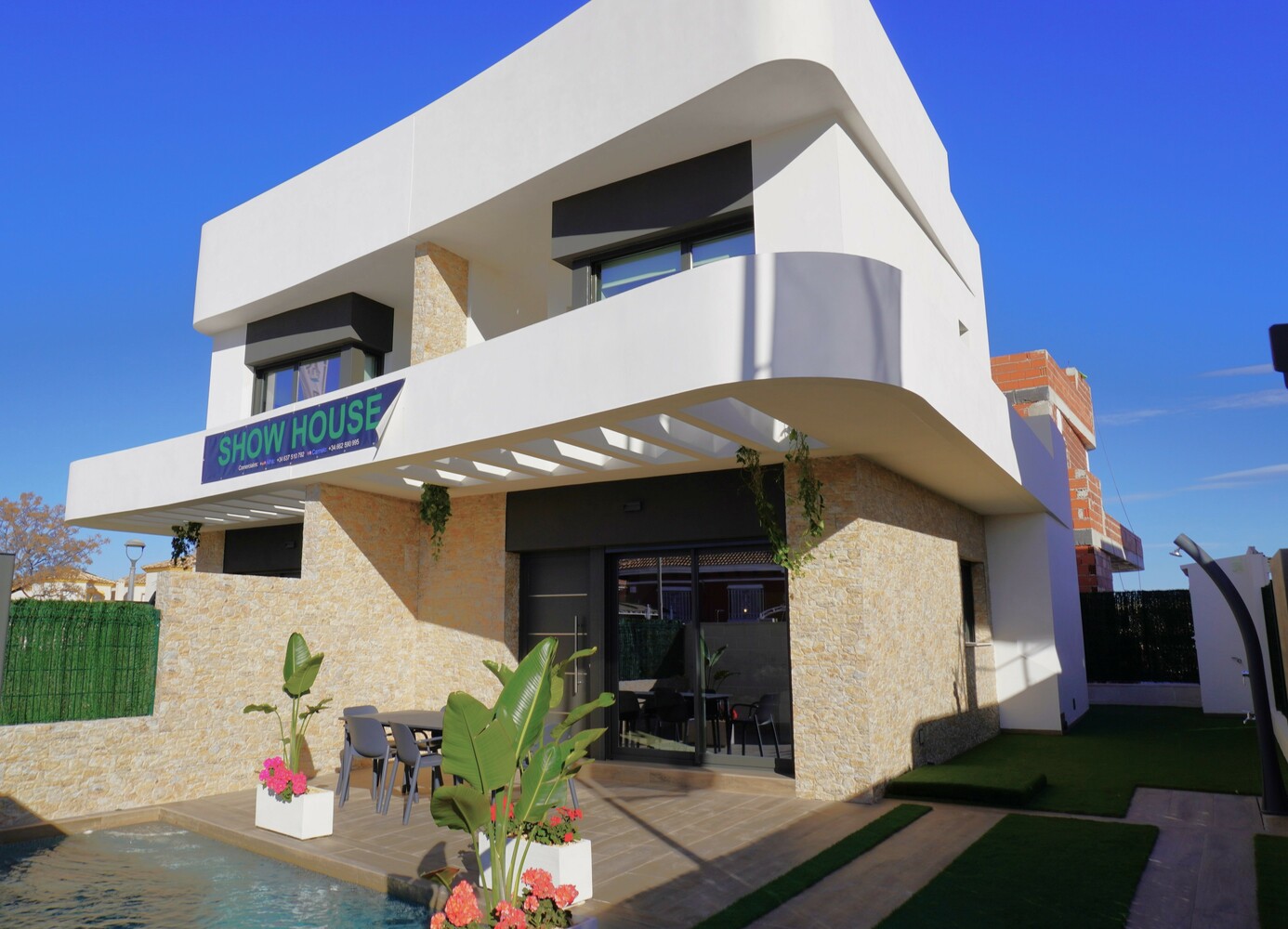 Opvallend mooi ontworpen twee onder een kap Villa’s, deels met tegels aan de buitenzijde, zijn voorzien van 2 slaapkamers en 2 badkamers. De 2 slaapkamers en 2 badkamers en suite bevinden zich op de 1e verdieping. De master bedroom heeft een balkon van 4,5 m2. De woning met zeer grote living van 41,5 m2 heeft een mooie lichtinval. De moderne open keuken en de schitterende trap met rvs leuning zijn echte eyecatchers. Beneden is er nog een gastentoilet en er is een aparte wasruimte. De tuin met aangelegd terras, kunstgras en deels tegels aan de voor- en zijkant heeft een oppervlak vanaf 92,5 m2 en is inclusief een privé zwembad en buitendouche. De woningen hebben allen een eigen oprit. Het solarium van 31 m2 is een heerlijk zonneterras met mooi uitzicht op het roze zoutmeer van Torrevieja. Het dorp is op loopafstand.