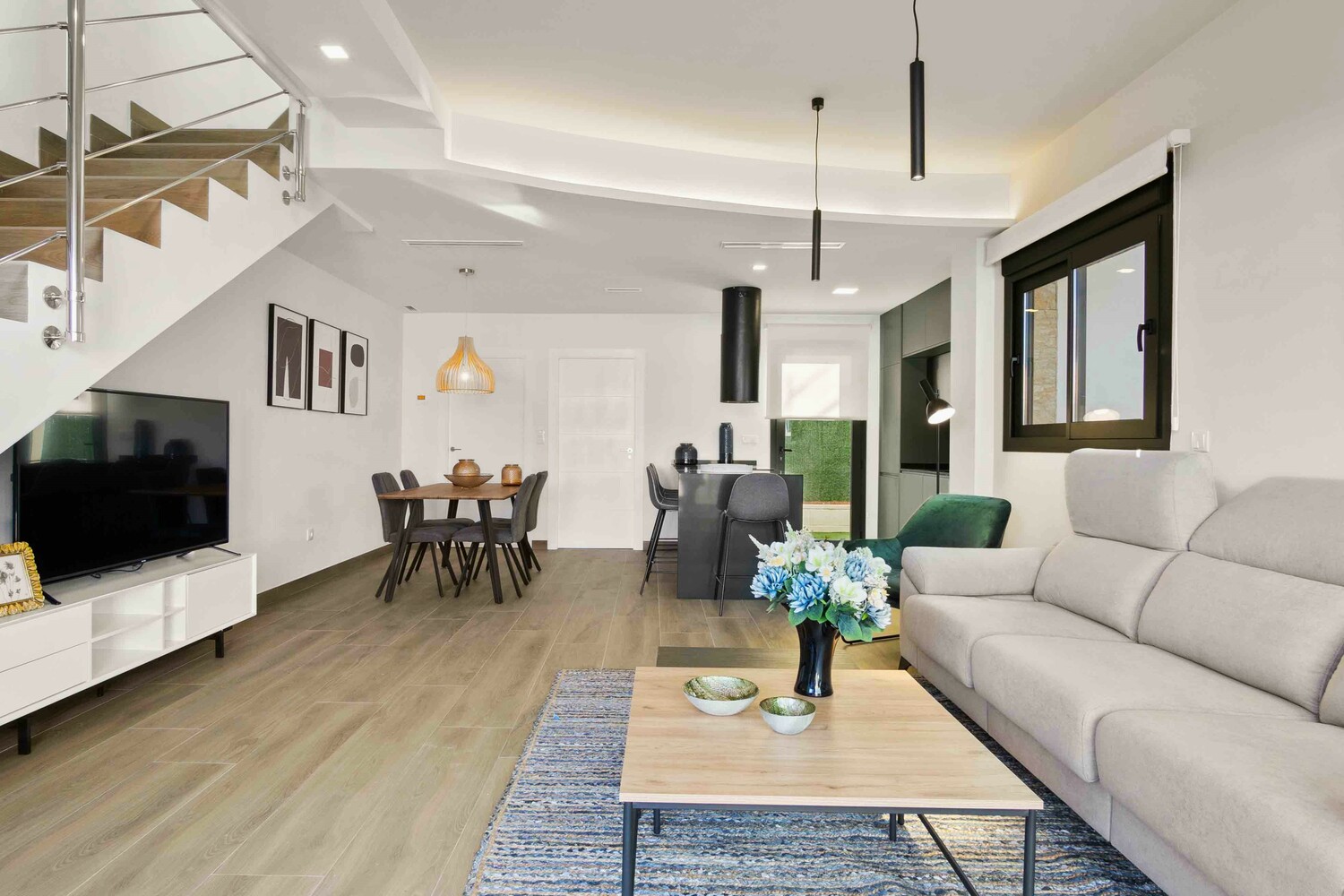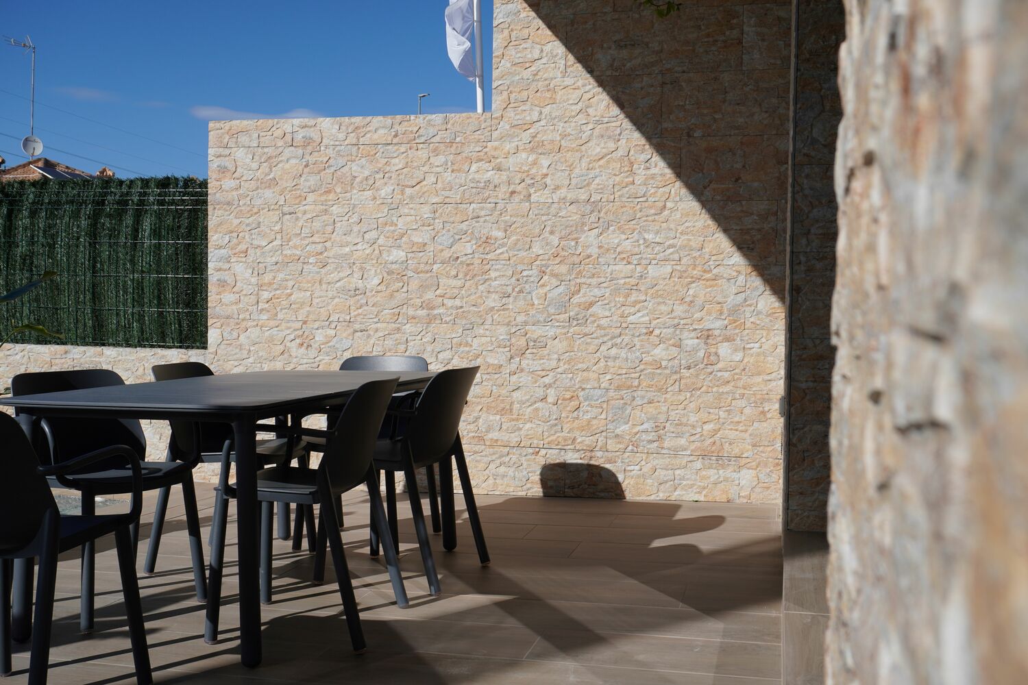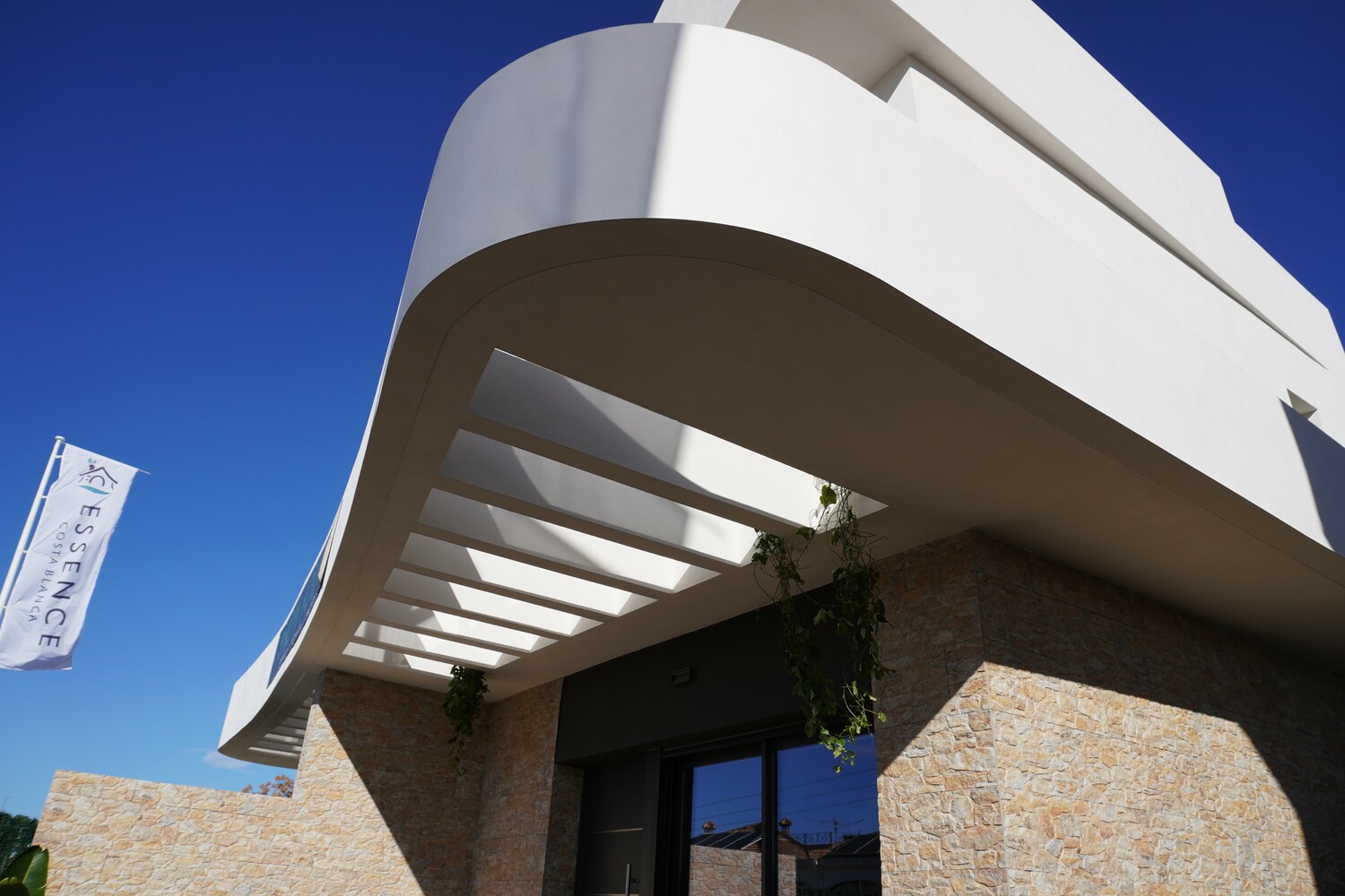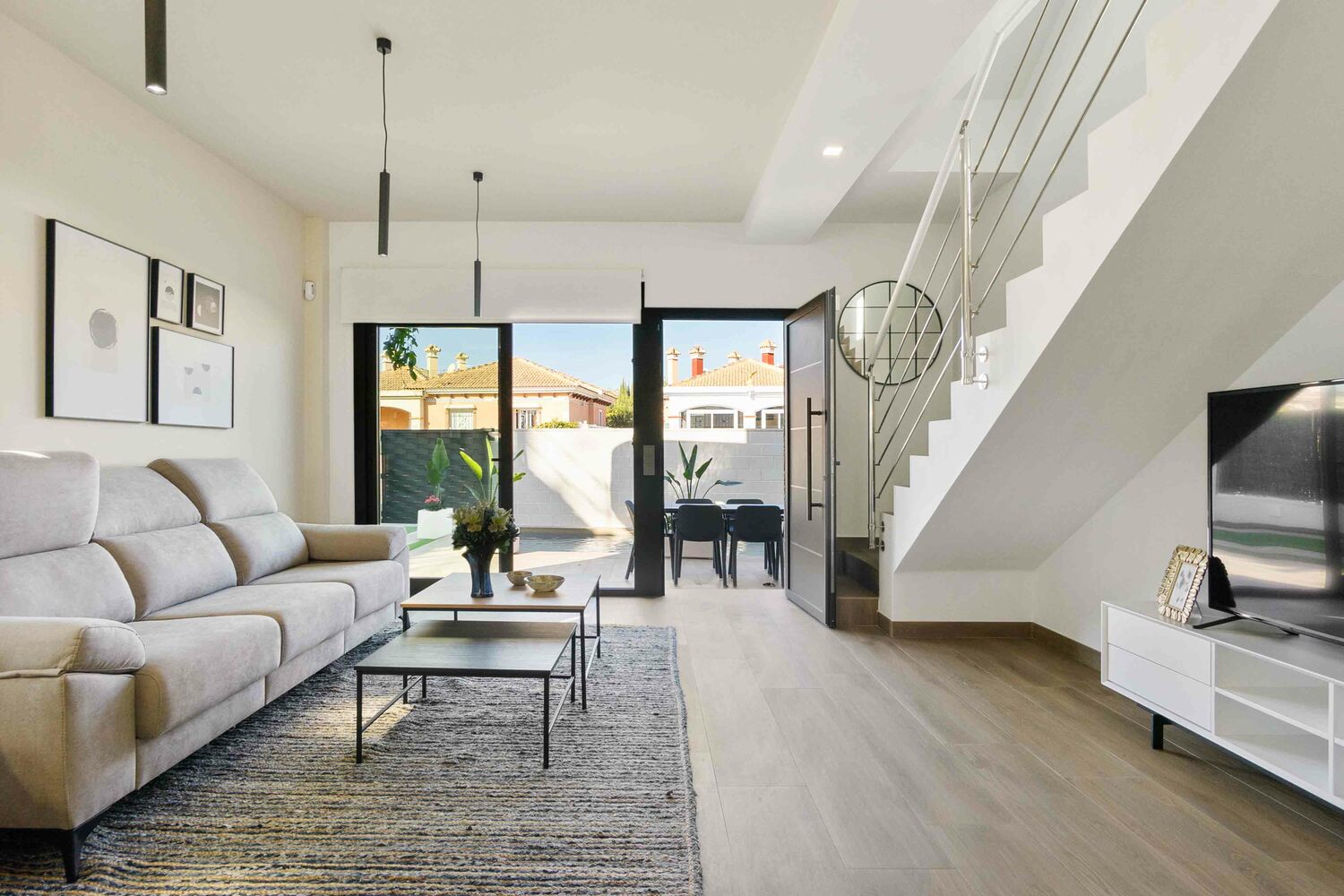 Opvallend mooi ontworpen twee onder een kap Villa’s, deels met tegels aan de buitenzijde, zijn voorzien van 2 slaapkamers en 2 badkamers. De 2 slaapkamers en 2 badkamers en suite bevinden zich op de 1e verdieping. De master bedroom heeft een balkon van 4,5 m2. De woning met zeer grote living van 41,5 m2 heeft een mooie lichtinval. De moderne open keuken en de schitterende trap met rvs leuning zijn echte eyecatchers. Beneden is er nog een gastentoilet en er is een aparte wasruimte. De tuin met aangelegd terras, kunstgras en deels tegels aan de voor- en zijkant heeft een oppervlak vanaf 92,5 m2 en is inclusief een privé zwembad en buitendouche. De woningen hebben allen een eigen oprit. Het solarium van 31 m2 is een heerlijk zonneterras met mooi uitzicht op het roze zoutmeer van Torrevieja. Het dorp is op loopafstand.